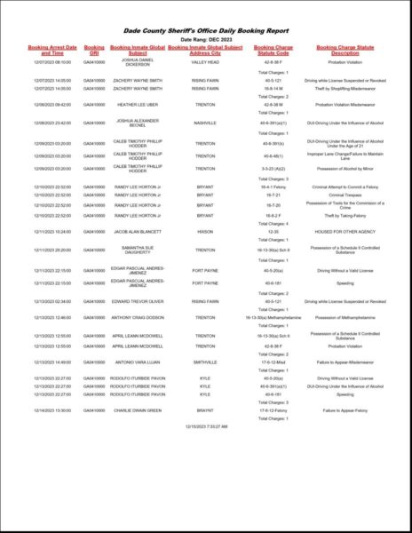 HomeArrest ReportsDade County Arrest Report: December 7-14, 2023Dade County Arrest Report: December 7-14, 2023Fri, December 15, 2023 SHARE NOW Loading advertisement…