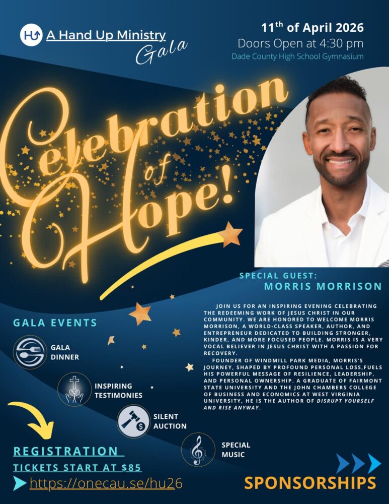 A Hand Up Ministry will host its annual Celebration of Hope Gala on Saturday, April 11, 2026, at the Dade County High School Gymnasium. Doors open at 4:30 p.m.