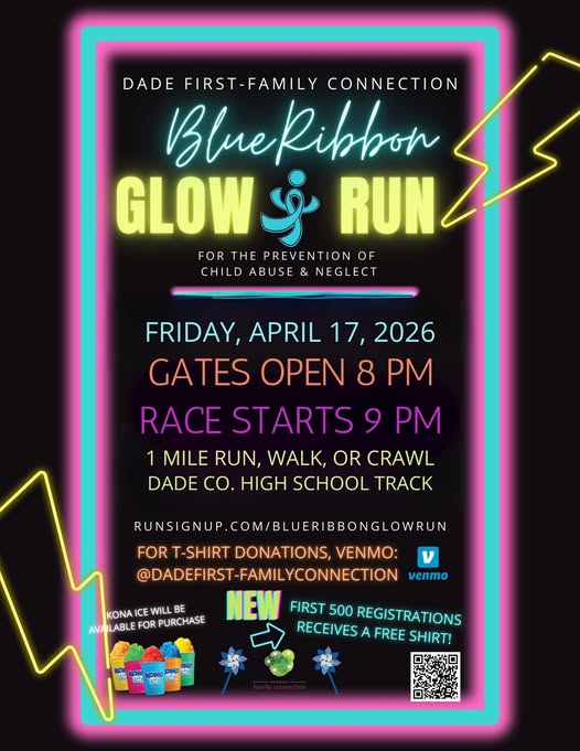 Dade First-Family Connection will host the Blue Ribbon Glow Run on Friday, April 17, 2026, at the Dade County High School track. This fun, family-friendly nighttime event raises awareness for the prevention of child abuse and neglect.