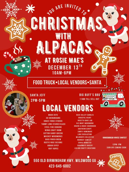 Get ready for a festive day filled with holiday cheer, local vendors, delicious food, and of course… alpacas!