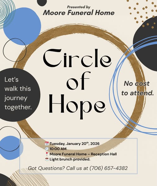 Moore Funeral Home invites you to Circle of Hope, a gentle and supportive gathering for anyone navigating loss or seeking connection and encouragement. You don’t have to walk this journey alone — let’s walk it together.