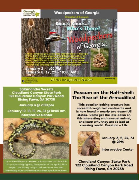 All programs are held at Cloudland Canyon State Park, 122 Cloudland Canyon Park Road, Rising Fawn, GA. Programs are family-friendly and a great way to explore North Georgia’s natural heritage this winter.