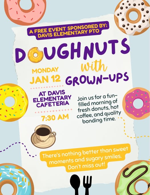 Join us Monday, January 12, at 7:30 a.m. in the Davis Elementary Cafeteria for fresh doughnuts, hot coffee, and quality bonding time between students and the special grown-ups in their lives.