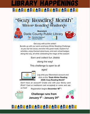 For more information or assistance with registration, visit the Dade County Public Library or ask a staff member during your next visit. Cozy up with a good book and make January a month full of reading!