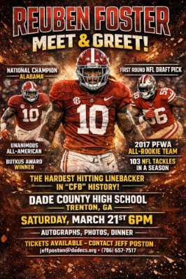 Football fans will have the opportunity to meet one of the hardest-hitting linebackers in college football history when Reuben Foster visits Dade County High School in Trenton on Saturday, March 21.