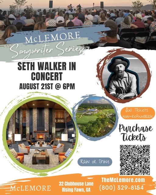 RISING FAWN, GA – Music lovers are invited to an unforgettable evening of live music, mountain views, and cozy ambiance as McLemore continues its acclaimed Songwriter Series with a performance by the soulful Seth Walker on Thursday, August 21 at 6:00 p.m.