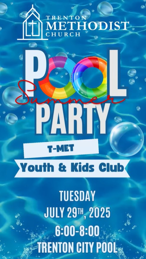 Dive into summer fun! 🌊 Trenton Methodist Church invites all T-MET Youth & Kids Club members to a special Summer Pool Party — and you won’t want to miss it!