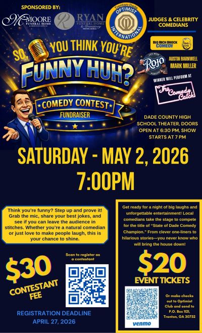 Get ready for a night of laughs as the “So, You Think You’re Funny, Huh?” Comedy Contest Fundraiser takes center stage on Saturday, May 2, 2026 at Dade County High School Theater.