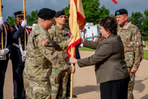 Brenda Lee McCullough, director, IMCOM-Readiness U. S. Army Installation Management Command, (CENTER) passes command of U.S. Army Garrison Fort Hood to Col. Chad R. Foster (LEFT) May 27, 2021. Col. Jason A. Westbrock, former Fort Hood Garrison commander, (RIGHT) looks on. Westbrock will assume duties as the First Army Division West chief of staff for his next assignment. (U.S. Army photo by Sgt. Evan Ruchotzke, 7th Mobile Public Affairs Detachment)