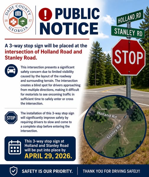 At the request of the Dade County Sheriff’s Office, a 3-way stop sign will be installed at the intersection of Holland Road and Stanley Road following approval by the Dade County Board of Commissioners.