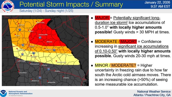 A major winter storm is still expected to bring significant impacts to North Georgia, including Metro Atlanta, this weekend. The Winter Storm Watch has been expanded southward to include all counties north of I-20, the entire Metro Atlanta area, and several counties north and east of Macon.