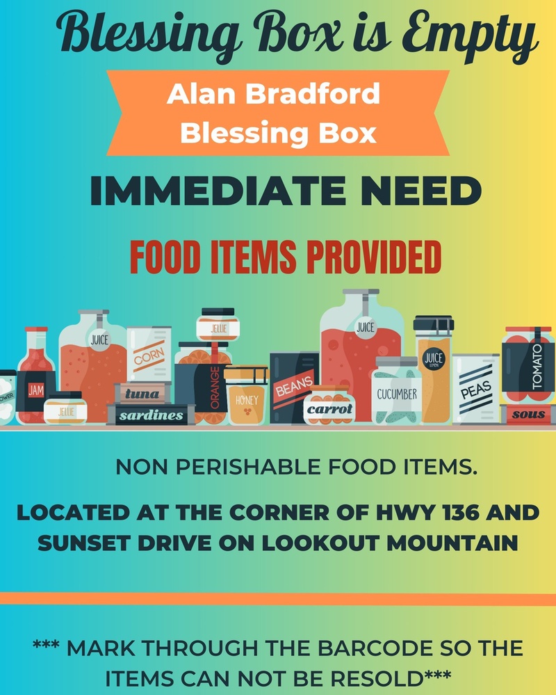 Our community is in immediate need of non-perishable food items to restock the Blessing Box located at the corner of Hwy 136 and Sunset Drive on Lookout Mountain.