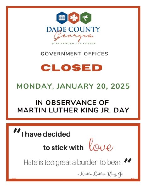 Dade County government offices will be closed Monday, January 20, 2025, in observance of Martin Luther King, Jr. Day.