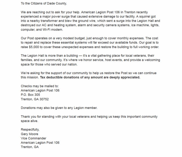The American Legion Post 106 in Trenton is asking for the community’s support after a recent power surge caused significant damage to its facility, destroying key equipment and systems used to serve local veterans. The Post, which operates on a limited budget, is working to raise funds to repair and replace the damaged items so it can continue providing a vital gathering space for veterans, their families, and the Dade County community.