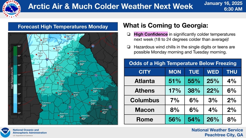 According to the National Weather Service, arctic air will arrive next week and confidence in much colder weather is high. This image shows the forecast high temperatures for Monday and the odds of high temperatures below freezing through the middle of the week.