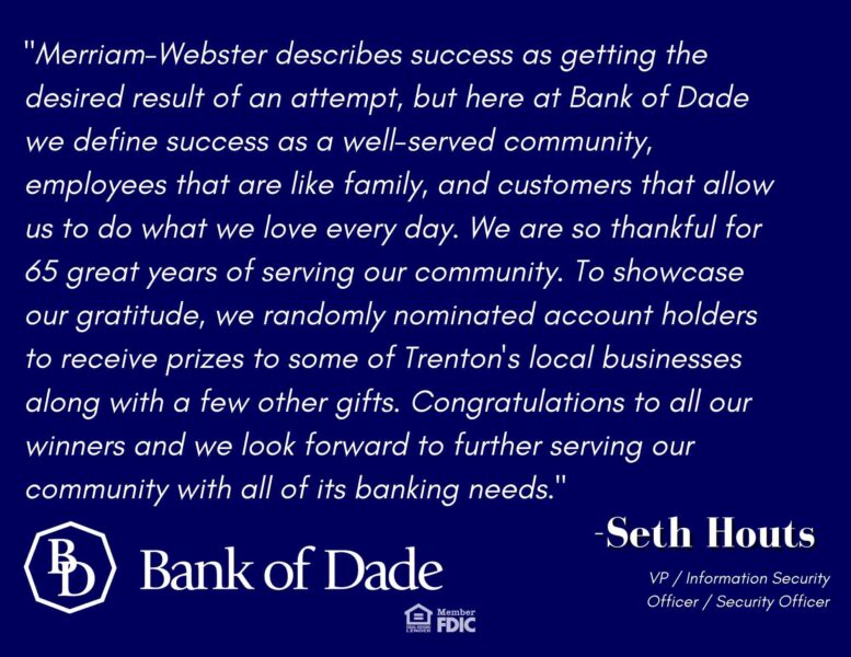 HomeLocalBank of Dade Celebrates 65 Years With Customer Appreciation MonthBank of Dade Celebrates 65 Years With Customer Appreciation MonthTue, December 7, 2021 SHARE NOW Loading advertisement…