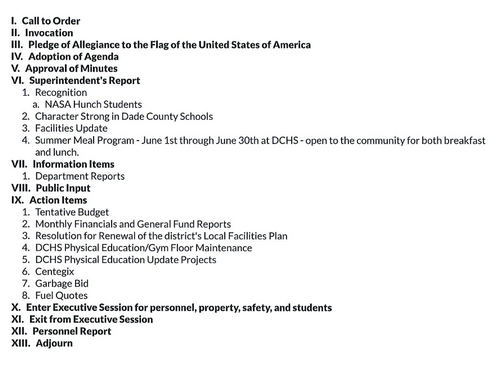 The Dade County Board of Education will be having their regular meeting tonight, May 22nd. As such, the following will be on their agenda.
