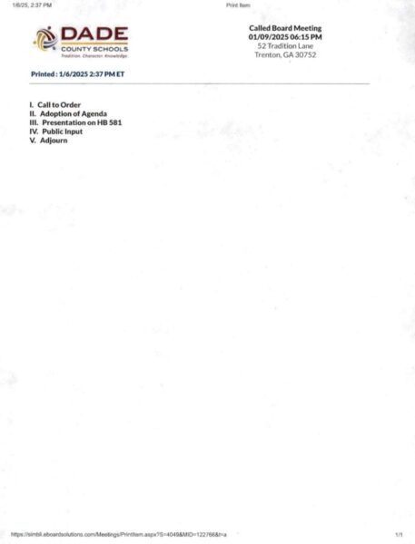 Agenda For Called Dade County Board Of Education Meeting Jan 9th