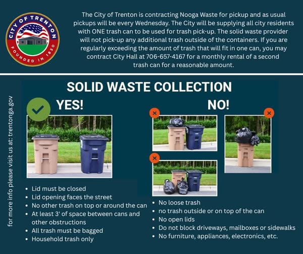TRENTON, Ga. — The City of Trenton is preparing to implement new solid waste collection requirements as it transitions to contracted pickup service through Nooga Waste.