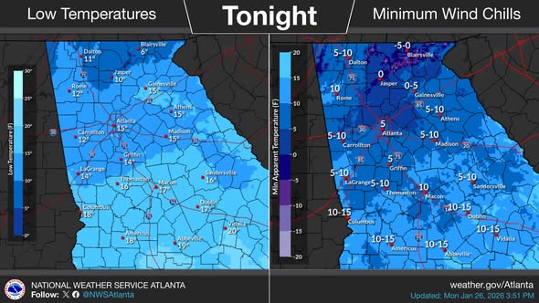 Wind chills — or “feels like” temperatures — are forecast to range from -5 to 5 degrees across north Georgia, with 5 to 15 degrees possible in central Georgia.