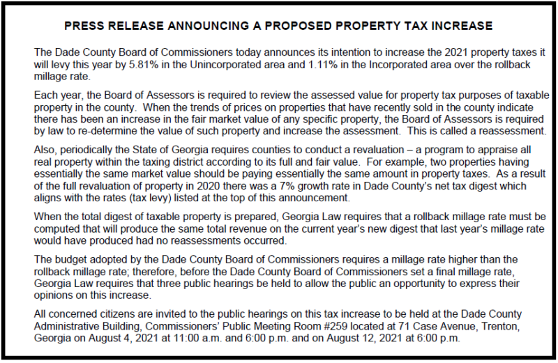 Notice was given to Dade County residents that, based on the proposed millage rate, there will be a required increase in Unincorporated Area property tax of 5.81% and Incorporated Area property tax of 1.11%. Goff explained later in the meeting, in response to questions about why the City of Trenton’s tax was lower, that it was a common misconception by County residents: He stated that what people don’t understand is that those who live within the city limits pay both taxes.