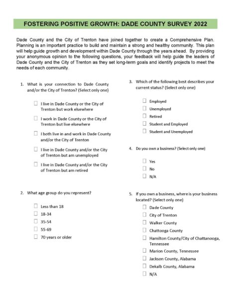 The City of Trenton, in conjunction with the Dade County Board of Commissioners, has published a survey to garner public feedback regarding the 2022 Joint Comprehensive Plan.