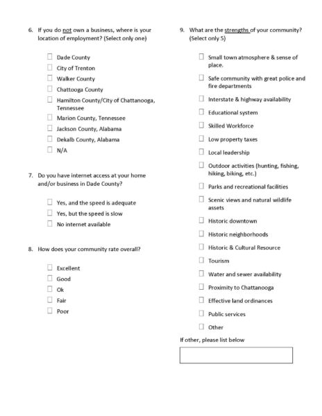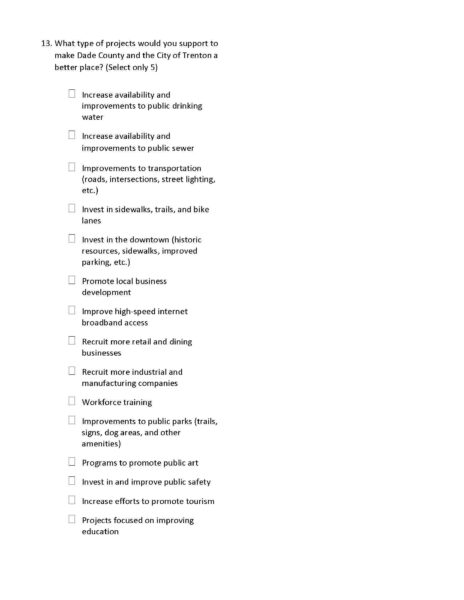 From Mayor Alex Case; “The Comprehensive Plan is a representation of a shared vision on reaching an achievable future and to best meet local needs. This survey was created with your input; as such, you are a vital role in this process. I cannot speak more highly with an appreciation for your input and for representing both Dade County and the City of Trenton. If you have any questions, please contact me.” The mayor then posted the following contact information: