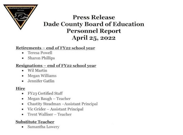 Monday night, the Dade County Board of Education held their monthly meeting, where they discussed personnel for the upcoming 2022-2023 school year.