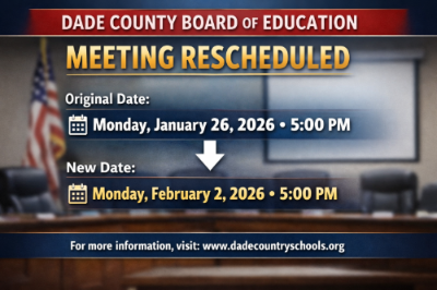 The Dade County Board of Education has announced that its scheduled meeting for Monday, January 26, 2026, at 5:00 p.m. has been rescheduled. The meeting will now take place on Monday, February 2, 2026, at 5:00 p.m.