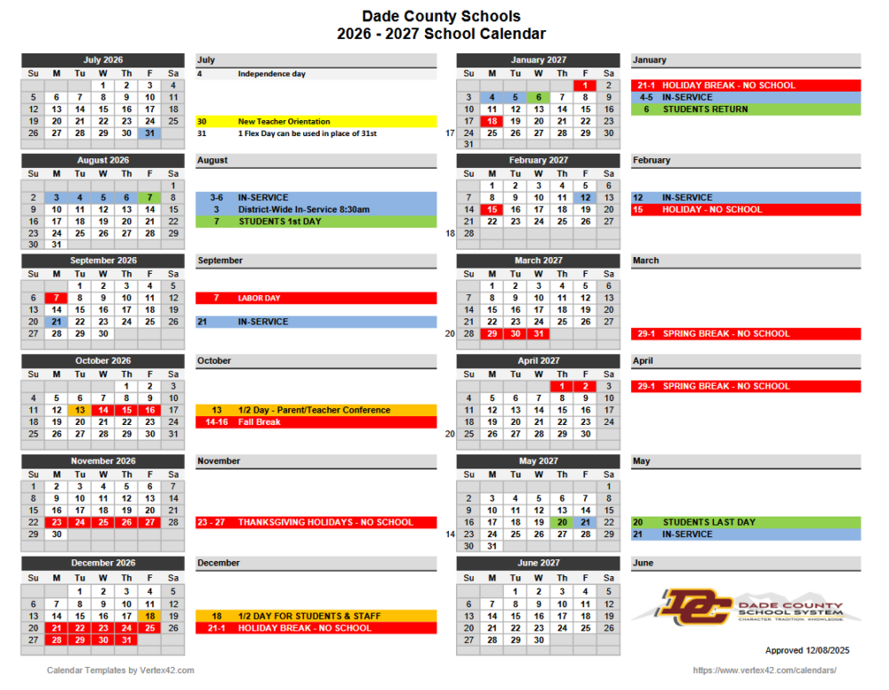 The full calendar will be posted at the district’s website: dadecountyschools.org
