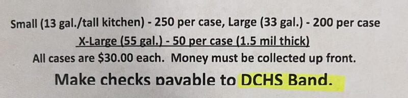 HomeLocalDade County High School Band Trash Bag SaleDade County High School Band Trash Bag SaleWed, January 29, 2025 SHARE NOW DCHS Band has begun their annual trash bag sale today! See your nearest band student, parent, or staff member to place your order! Loading advertisement…