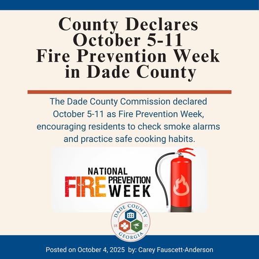 TRENTON, Ga. (October 5, 2025) — The Dade County Board of Commissioners has officially declared October 5–11, 2025, as Fire Prevention Week in Dade County, encouraging residents to take steps to safeguard their homes and families from fire hazards.