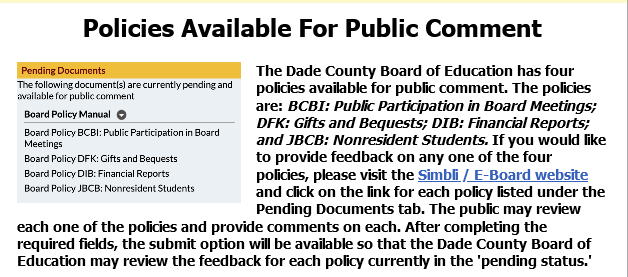 The Dade County School Board has four polices for upcoming update. These are now available for you to have input on, just visit their website.