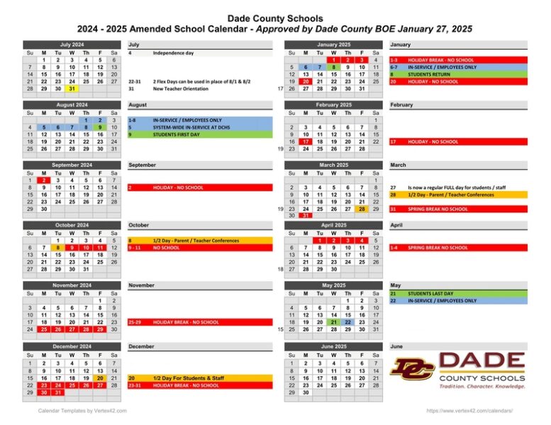 for students and March 28th is a half-day with parent-teacher conferences. For a copy of the updated 2024 – 2025 DCS School Calendar, click this link https://www.dadecountyschools.org/
