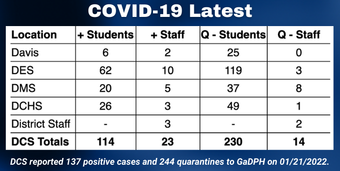 Dade County School System report 137 positive COVID-19 cases, along with 244 quarantines on their weekly report to the Georgia Department of Health. The breakdown is as follows: