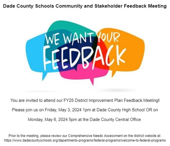 For those unable to attend the meetings in person, the Comprehensive Needs Assessment is available for review on the district website at the following link: https://www.dadecountyschools.org/departments-programs/federal-programs/welcome-to-federal-programs.