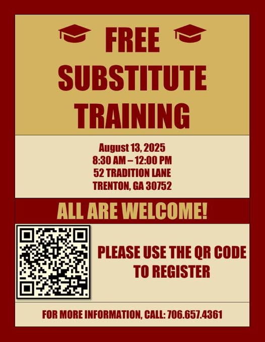 The first substitute training session will take place on Tuesday, August 13, at Dade County High School. This is a great opportunity for those who enjoy working with students and want a flexible work schedule.