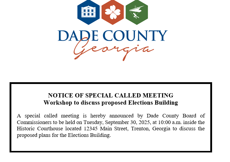 TRENTON, Ga. — The Dade County Commission will hold a special called meeting at 10 a.m. Tuesday, Sept. 30, to discuss the proposed new elections building. The meeting will take place at the Dade County Historic Courthouse in downtown Trenton.