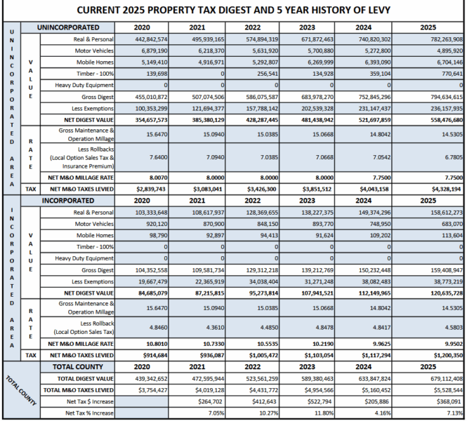 Despite the increase in collections, the millage rate will remain unchanged at 7.7500. County officials say the higher revenue is the result of increased property values and growth in the county’s tax base, not a rate hike.