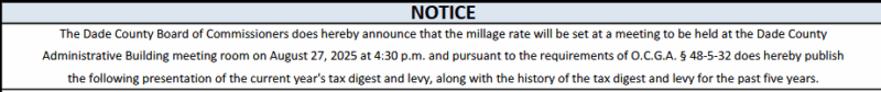 Dade County, GA – Dade County will hold three public hearings in August to review and adopt the 2025 millage rate.
