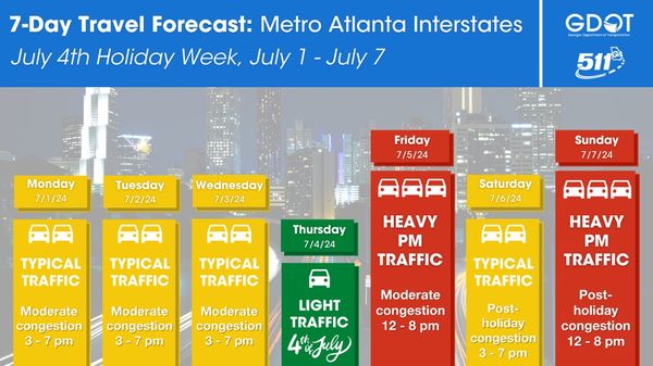 Heading out of town this week? The Georgia Department of Transportation has produced this guide using historical travel patterns to predict traffic flow on metro Atlanta interstates leading into the holiday weekend.