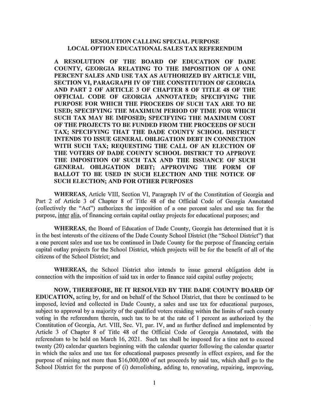 In less than two weeks after a run off election in Georgia, Dade County voters will be asked to go back to the poles in March. The Dade County Board of Education met Friday January 15th, and passed a resolution calling for the continuation of the E-SPLOST in Dade County. If approved by the voters it would be a continuation of a 1 cent sales tax that would raise up to 16 million dollars over the next 6 years for the purpose of capital improvements for the Dade Country School system.