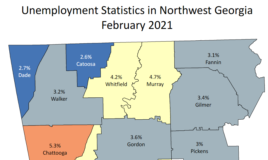 Unemployment rates in the North Georgia area continue to drop despite Covid-19 restrictions. Dade County has dropped to an impressive 2.7% according to the latest statistics. Statistics show there is only 212 out of 7,947 people in the Dade County work force that are currently unemployed. Most businesses in the Dade County area are still actively seeking employees.