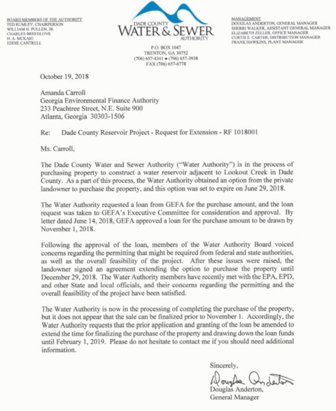 The letter from the Water Authority to the Georgia Environmental Finance Authority (GEFA) that is included in this article will only upset you more as it did me. We appoint board members to the water board to try to keep politics out of such an important entity like our county owned water company. I am very disappointed in the way our appointed board members handled this land purchase and here’s why, if you have been appointed as a board member to the water authority you have been entrusted to act in the best interest of Dade County citizens.