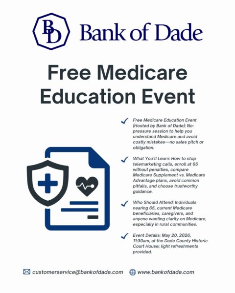 The Free Medicare Education Event, hosted by Bank of Dade, is scheduled for May 20, 2026, at 11:30 a.m. at the Dade County Historic Courthouse in Trenton.