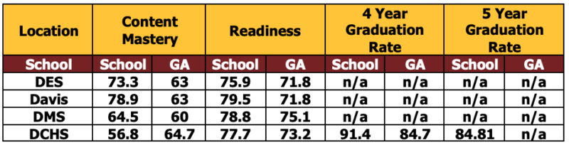 The indicators which have been reported for all schools include Content Mastery, Readiness, and Graduation Rates for high schools. A summary of Dade County Schools performance data and how we compare to the state of Georgia has been provided below.