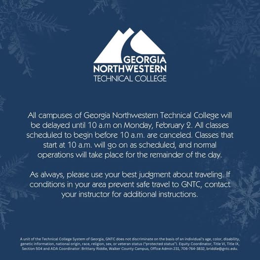 Georgia Northwestern Technical College will operate on a delayed schedule Monday, February 2, due to weather conditions affecting the region.