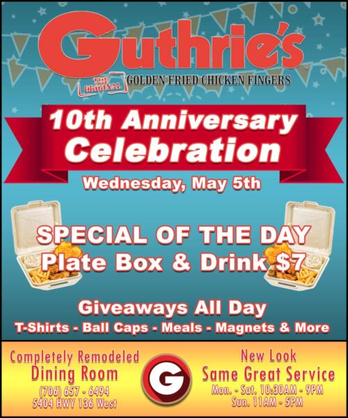 HomeLocalGuthrie’s 10th Anniversary Celebration today 10:30 AM till 9:00 PMGuthrie’s 10th Anniversary Celebration today 10:30 AM till 9:00 PMWed, May 5, 2021 SHARE NOW Loading advertisement…