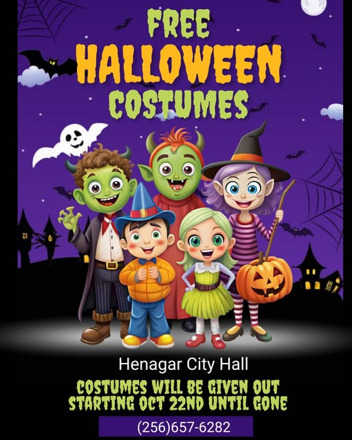 Beginning Wednesday, October 22, residents can pick up free new and gently used costumes at Henagar City Hall. On opening day, distribution will run from 10 a.m. to 4 p.m. Starting Thursday, costumes will be available Monday through Friday from 8 a.m. to 4 p.m. while supplies last.