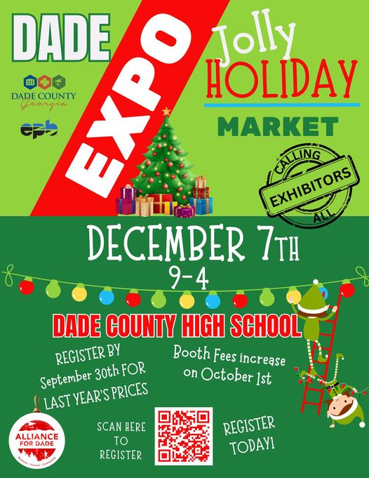 Its that time again – Calling all Exhibitors for the Dade Expo Jolly Holiday Market. It will be on December 7, 2024 from 9a – 4p. You can go online to register by September 30th for Last Year’s prices. Booth Fees increase on October 1st. Link to register is https://alliancefordade.com/dade-expo/ or you can scan the QR code.
